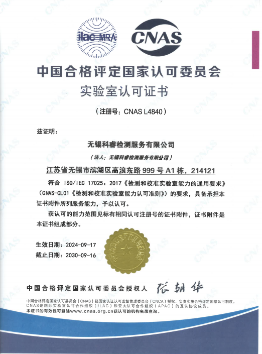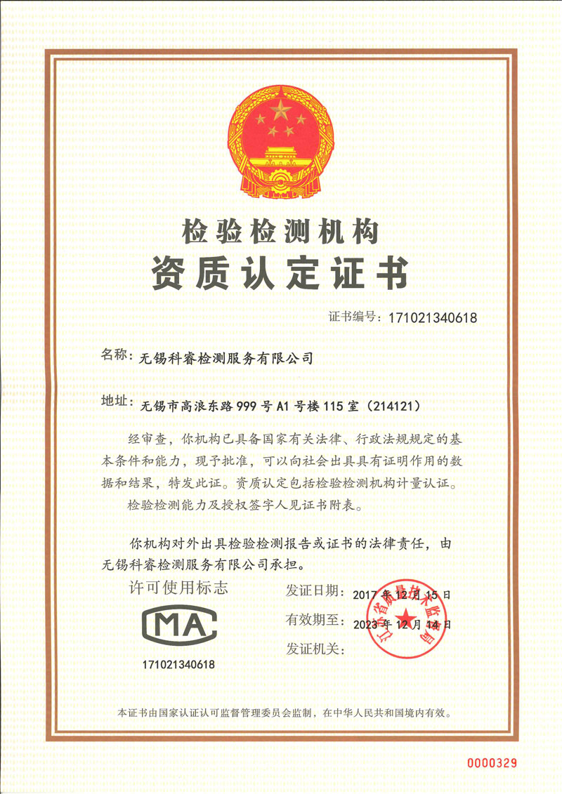 2010年取得CNAS證書,是無錫較早取得證書的民營第三方檢測公司,2014年獲得江蘇省民營科技企業(yè)的稱號,2017年獲得檢驗檢測機構(gòu)資質(zhì)認定證書(CMA)等多項榮譽資質(zhì)。 科睿檢測始終追求先進科學(xué)的技術(shù),過硬質(zhì)量,貼心售后服務(wù)贏得了良好的市場口碑,客戶總數(shù)已達到1000 家以上,中國500強企業(yè)已超過100家。
